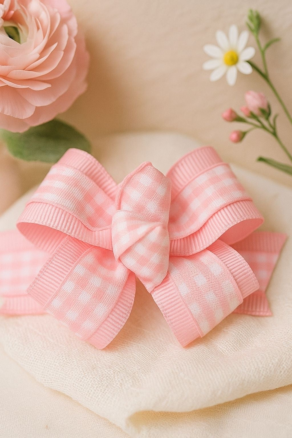 Hermoso lazo con pinza, rosa con detalles blancos, perfecto para una primavera inolvidable