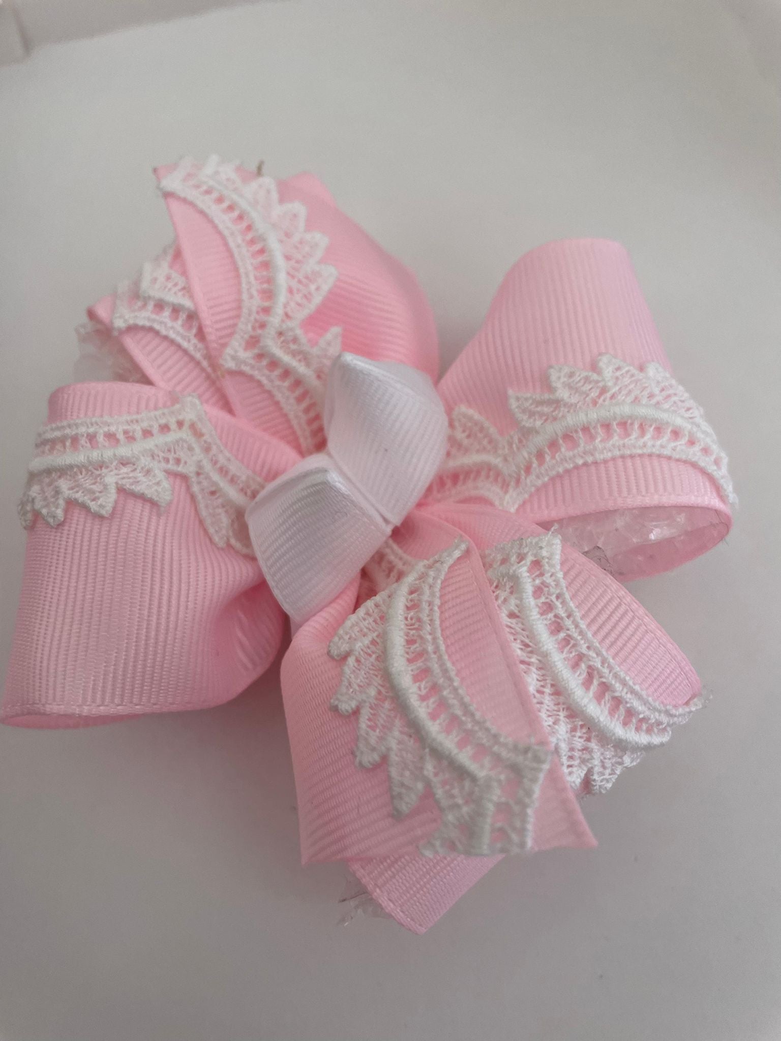 Lazo tradicional, rosa claro y delicado con detalles tejidos a mano en tonalidades blancas. Elegante y coqueto
